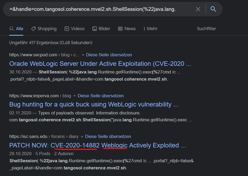 Checking Google, just with pasting the payload used, we do get what CVE might have been exploited and in which application (WebLogic).