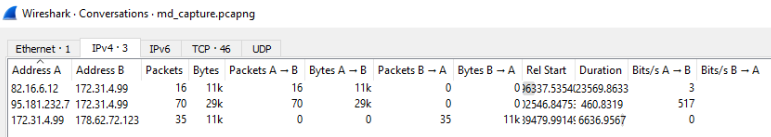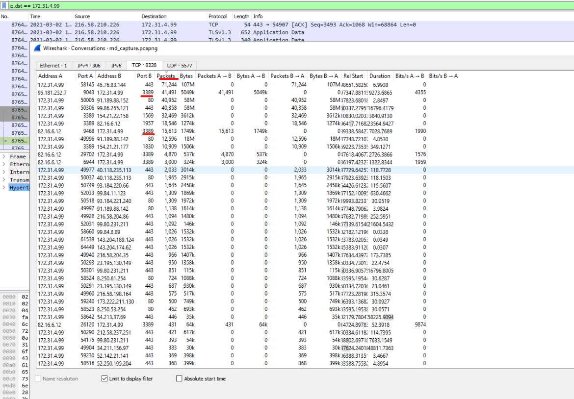 Taking another look at the Conversation statistics is only by using ip.dst==172.31.4.99 and limiting results to the filter, we see that port 3389 is being used extensievly as well. Two IP’s have used RDP with the box which are 82.16.6.12 and 95.181.232.7 nd will be checked later.