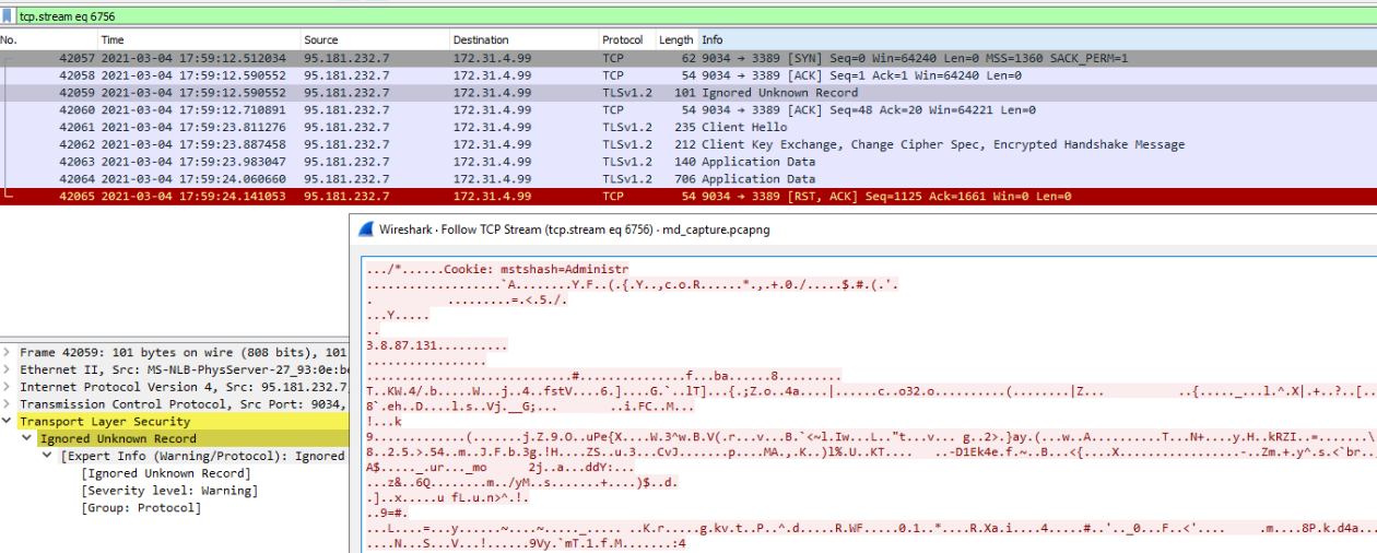 Now recall(!) we’ve saw connections on RDP/TCP3389 from two IP-Adresses 82.16.6.12 and 95.181.232.7 so let’s have a look in the wireshark. Filter: ip.dst==172.31.4.99 && tcp.port==3389 && (ip.src==82.16.6.12 || ip.src==95.181.232.7) as 82.16.6.12 has used RDP before and 95.181.232.7 used RDP shortly after attack, this one should be in our focus. Since RDP is encrypted there’s not much to see in the PCAP itself apart from this packet.