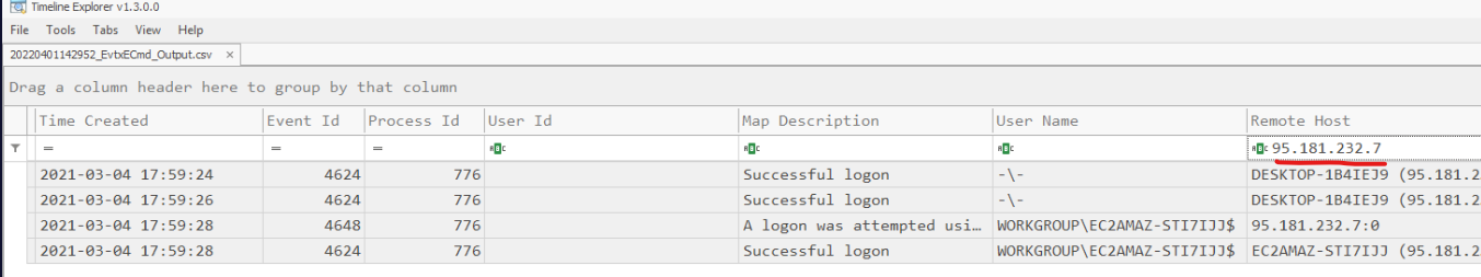 Opening output in Timeline Explorer and filtering on IP we can see that Login was successful.