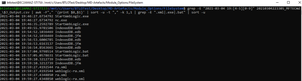 grep -E "2021-03-04 19:[4-5][0-9]" 20210304223305_MFTECmd_\$J_Output.csv | awk -F"," '{print $8,$1}' | sort -u -t "," -k 1,1 | grep -E ".xml|.exe|.bat" | sort -u