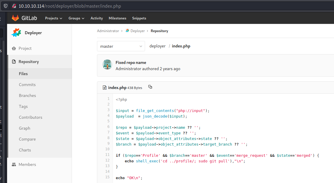 After checking both repositories on GitLab after logging in it seems that “Deployer” repository does few things including sudo git pull.