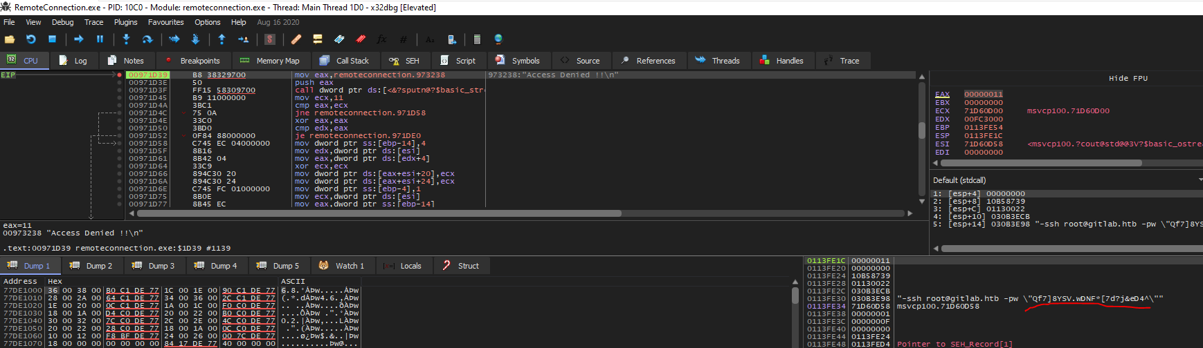 After SSHing onto the box with clave, there is file called “RemoteConnection.exe” in the clave’s home directory. I pulled that file to windows and used it with x32dbg. (didn’t work ghidra, or dnspy 64 bit!)