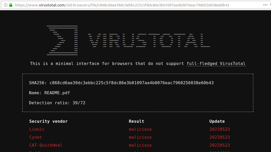 Uploading file to VirusTotal shows that file is most likely malicious: (I had to use version for old-browsers, but it’s still VirusTotal)