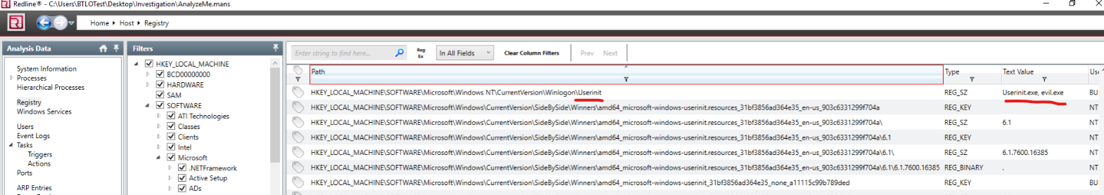 There’s an entry in registry (checking manually), which runs UserInit.exe and evil.exe on logon.